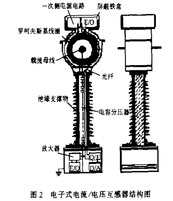 電流互感器設(shè)備由電流檢測單元和電壓檢測單元兩部分組成。前者選用羅柯夫斯基線圈作為電流傳感器,有源電子器件結(jié)束信號的數(shù)宇調(diào)制;后者選用電容分壓器作為電壓傳感器。高壓端電子線路電源由一個(gè)輔助電源感應(yīng)線圈直接從母線上獲取。羅氏線圈和電源感應(yīng)線圈安裝在母線上。高壓端信號調(diào)制和電源調(diào)度電路板置于·一個(gè)鐵磁屏蔽盒中,電流信號在高壓端經(jīng)AD轉(zhuǎn)化、E/O轉(zhuǎn)化后調(diào)制成光信號,經(jīng)過光纖傳送到低電位端。依據(jù)需求,可以將信號繼續(xù)用光纖傳送到遠(yuǎn)方的控制室,也可以就地經(jīng)O/E、D/A轉(zhuǎn)化,放大成仿照電流信號,母線電壓經(jīng)電容分壓器轉(zhuǎn)化成低壓信號后,調(diào)制成光信號,經(jīng)光纖傳送到控制室,也可以就地經(jīng)校準(zhǔn)、溫度補(bǔ)償后,給出仿照電壓信號、一個(gè)陶瓷套管既用作高壓部分元件的絕緣支撐,一起又是傳輸電流信號的光纖和電容分壓器的通道。