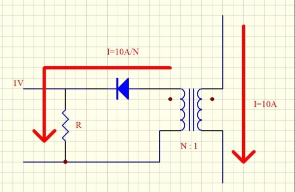 假定用電流互感器檢測變換器的原邊電流,原邊10A電流對應1V電壓。當然,我們可以用一個1V/10A=100mΩ的電阻來檢測,但是電阻將構(gòu)成的損耗為1V×10A=10W,這么大的損耗對簡直一切的規(guī)劃來說都是不能接受的。所以,要選用電流互感器,如圖1所示。