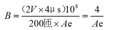 現(xiàn)在我們來看磁芯,假定二管是一般的一般的二管,通態(tài)電壓大約為1V,電流為10A/200=50mA?;ジ衅鬏敵鲭妷簽?/span>1V,加上二管的通態(tài)電壓1V,總電壓大約2V。250kHz頻率作業(yè)時,磁芯上的磁感應強度不會跨過