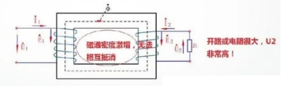 電流互感器在正常作業(yè)時(shí),它的一次磁勢(shì)與二次磁勢(shì)是彼此均衡的。一旦二次側(cè)開路,二次電流等于零,一次線圈的電動(dòng)勢(shì)堅(jiān)持不變,一次電流悉數(shù)成為勵(lì)磁電流,這將引起鐵芯中磁通量Φ急劇上升,這個(gè)急劇上升磁通量或許引起鐵芯磁飽或許或許在二次側(cè)感應(yīng)出較高的電壓。